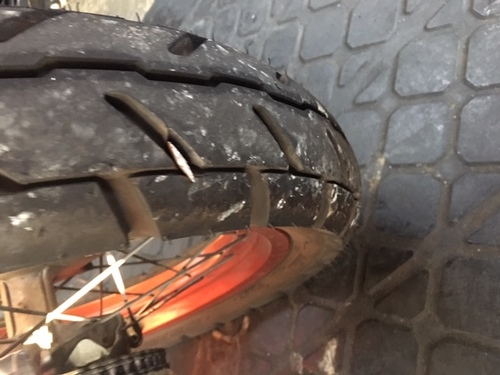 先日タイヤ交換したセロー250 タイヤがバーストしたとの事で入院です!! ぶっとい異物が刺さってました(;´Д`) こりゃ~タイヤ交換しないと無理です…