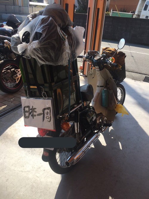 日本一周中のスーパーカブのオイル交換です☆ マンガに出てくる出前カブ並みに積載能力スゲー!(^^)! 後半戦も頑張ってくださいね☆