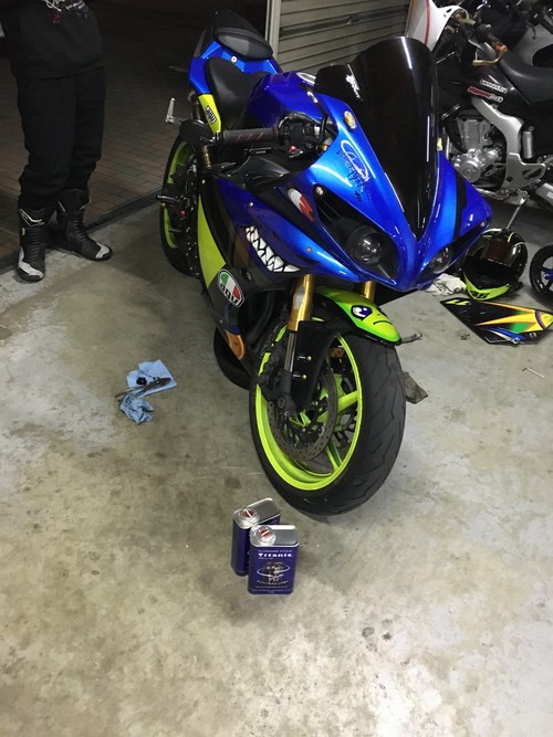 KくんのYZF-R1エンジンフラッシングとオイル&オイルエレメント交換です☆ 明日の嘉瀬川 お手柔らかにお願いします(^^;)