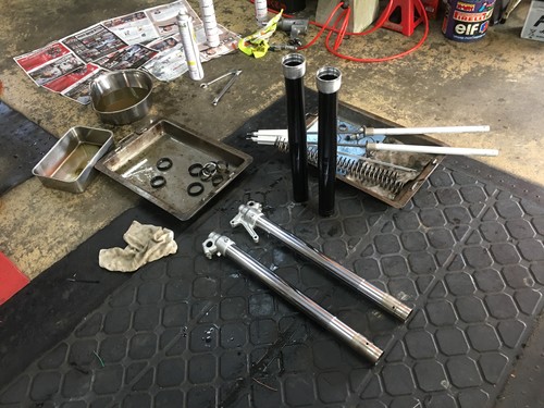 フロントのオイルのサラサラ具合にビックリしました(^^;) 水が混ざってたのが原因と思われます!! 十年くらい交換されてないみたいで今回のフォークオイルも なかなか熟成された臭いでした・・・(笑)